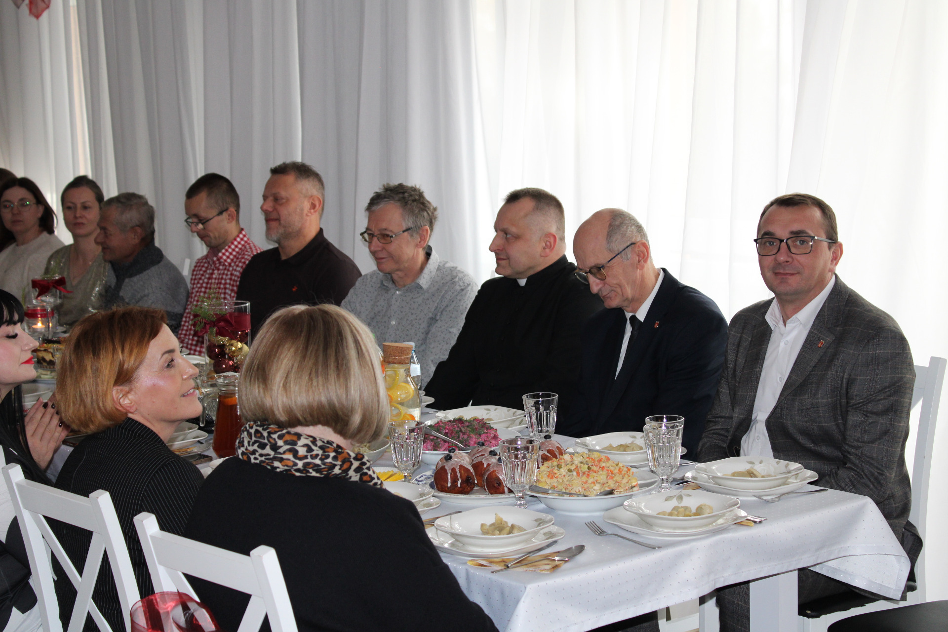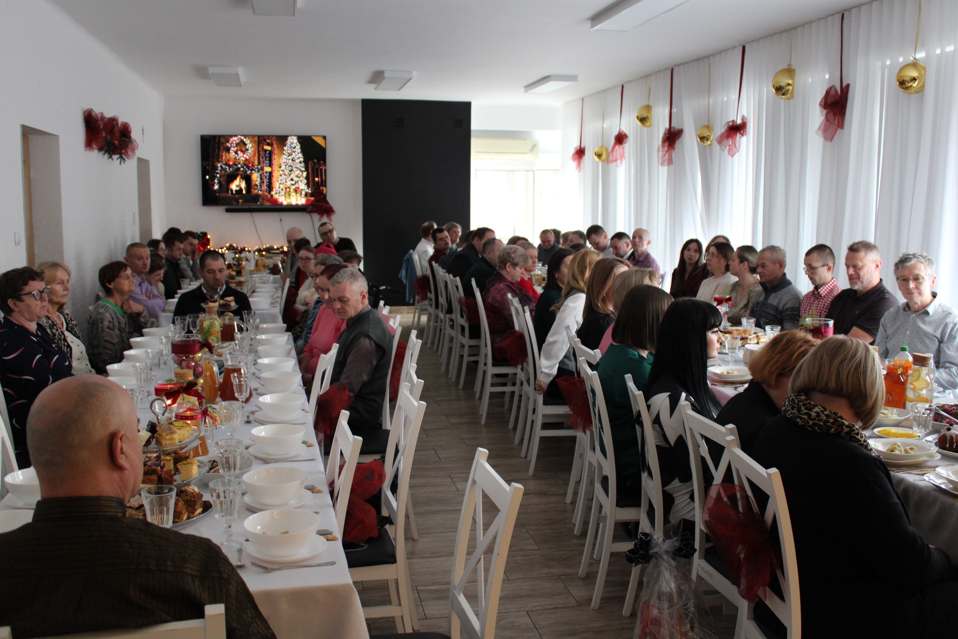 Następnie wszyscy zasiedli do posiłku. Przy dźwiękach pastorałek i kolęd serwowano tradycyjne potrawy, takie jak barszcz czerwony, pierogi z kapustą, rybę oraz inne świąteczne smakołyki. Wspólny posiłek sprzyjał rozmowom, integracji i umacnianiu więzi.